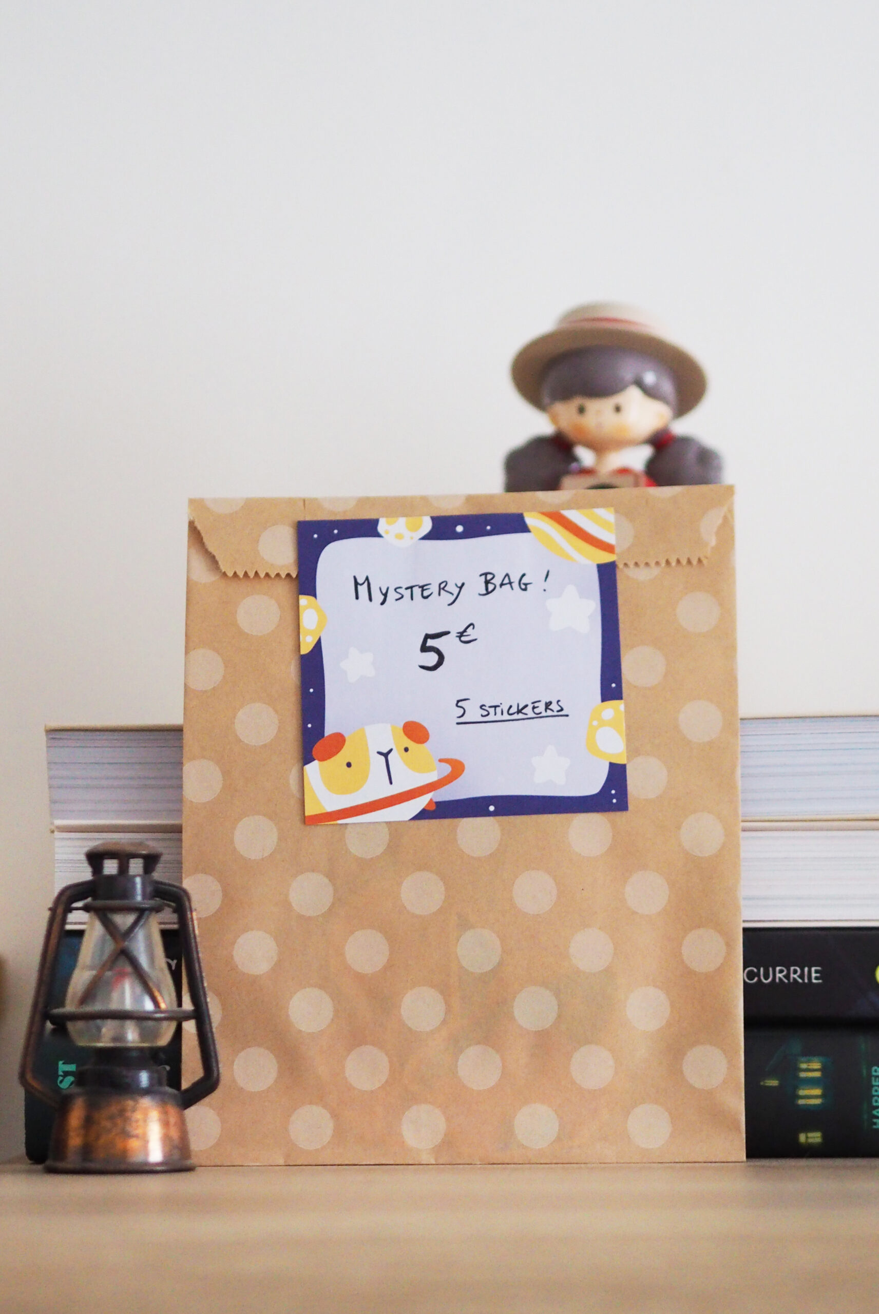 In this cute mystery bag, you’ll get 5 vinyl die cut stickers!